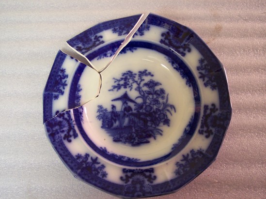 TWELVE-PANELLED RIM WITH GEOMETRIC AND FLORAL ORIENTAL DECORATION. CHINESE GARDEN SCENE IN CENTER. ALL IN FLOW-BLUE TRANSFER PRINT, WITH WHITE BACKGROUND.