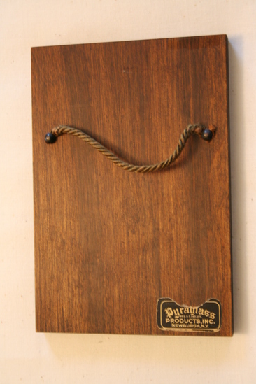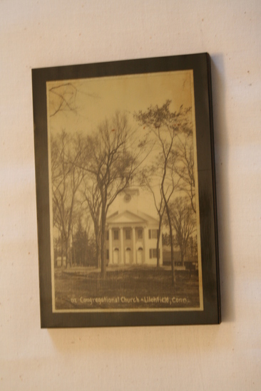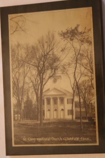 Wooden tile with image of Congregational Church taken from village green glued to it. Written on bottom "02 Congregational Church" "Litchfield, Conn" Image lacquered with polyurathene. Two nails with rope on back for hanging