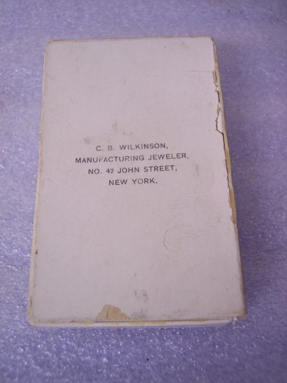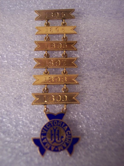 A: Medal - round, brass with blue enamel, "H" and "L" in blue overlap in center. "AMAT VICTORIA CURAM" printed in gold on blue enamel border around center of medal. Six brass rectangular bars attached by rings, one above the other, above the medal. Each bar engraved with a different year, starting with "1894" at top to "1899" at bottom. Strung together in numerical order. B: Cardboard box, covered in glossy white paper. Bottom lined with white silk. Lid hinged on short side, flips open. Printed on top of lid "C.B. Wilkinson/Manufacturing Jeweler/No 42 John Street/New York"