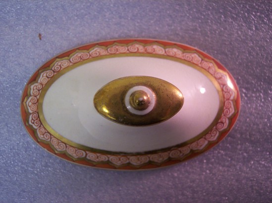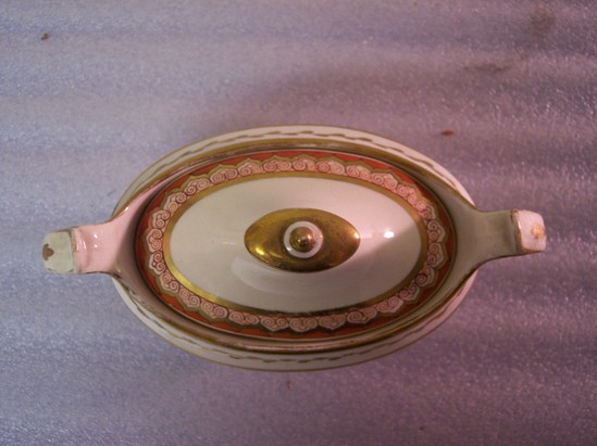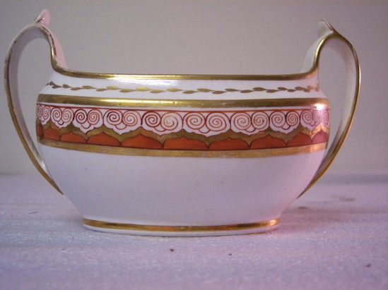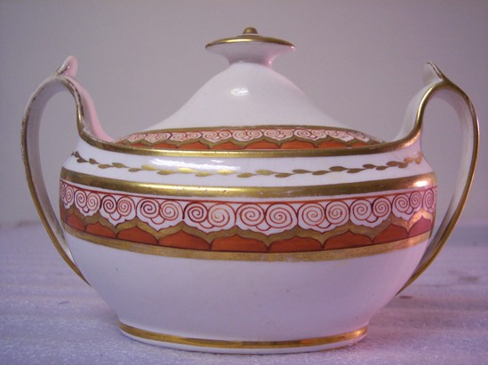 Sugar bowl (A) has a gilt vine motif and is decorated with gold bands, gold lines on handles, and a band with a gold border and red leaf and scroll. Sugar bowl is oval and has two handles. Lid (B) is oval as well. Marked "CS" and stamped "B 1994" and "F?NJ4995 21 Per." on the bottom. Asian inspired design. This is the wedding tea set of Anna Pierce Brace, (Mrs. Charles Loring, married May 6, 1818). Wedgwood #714, "Bittersweet." It was inherited from Mrs. Pennypacher's mother, Mrs. Ruth Loring Whitman; and by her from Mary Hopkins Loring; and by her from Anna Pierce Brace Loring.