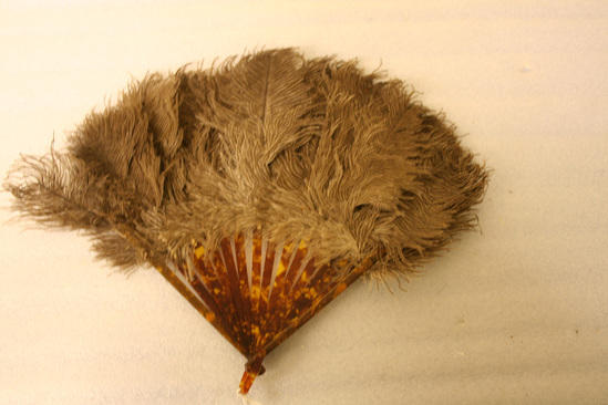 Fan with thin tortoise shell stretchers. Pinned at bottom with brass pin and tortoise shell loop. Brown/grey feathers (possibly ostrich) glued to each streatcher.