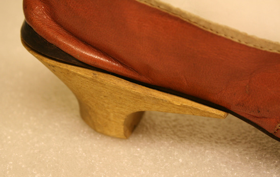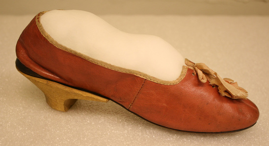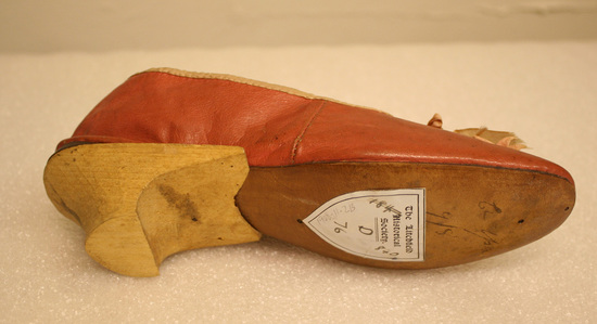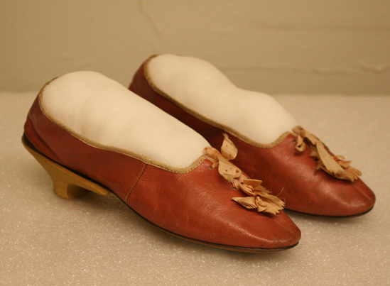 Pair of pink leather women's shoes. Lined with linen. Pink silk ribbon trim around opening. Lace up at toe with pink silk ribbon. Leather sole with woolden heel tacked onto bottom of shoe. "Samuel R. Crane New Haven" on interior of left shoe.