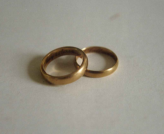 Gold band wedding ring. Engraved inside: "F. A. Tallmadge Eliza H. Canfield" "22"
