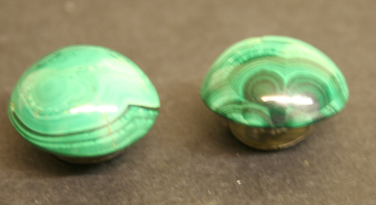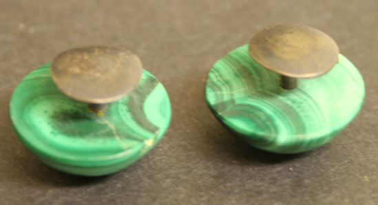 Pair of cuff links. Round domed buttons of malachite with silver mushroom shaped shanks.
