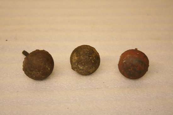 Three iron nails with large rounded heads. Squared shafts. One appears to have been painted red at one time.