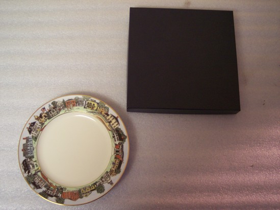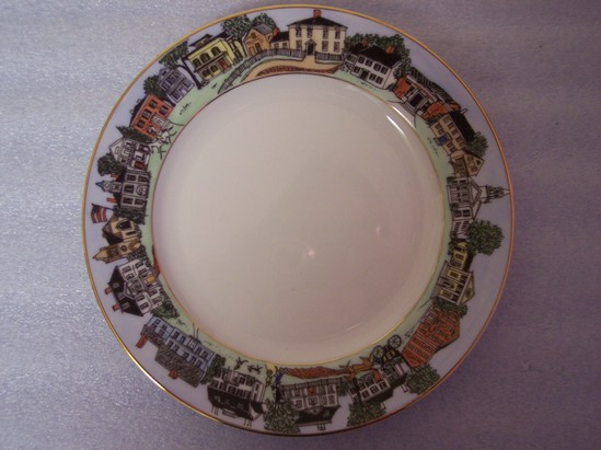 A hand painted porcelain collector's plate, gold rim, rim features a scene which includes 19 of Litchfield's historic public buildings and houses. Housed in original blue gift box with booklet outlining history of each of the buildings depicted. Created by LDA Creations, artist Cheryl Lyon, in 1997, a limited edition of 500 plates, # 1 of 500. signed on back of plate with number and description. Buildings include: TR House and Law School, Wolcott, Jr. Library, Museum building, Collins House and apothecary, Congregational Church, First National Bank of Litchfield, Jail, Corner or Butler House, Tallmadge House, Marsh House, Sheldon's Tavern, Methodist Church, Courthouse, J. Steale Bookshop, Litchfield Insurance, Phineas Minor or Sanctum Club, and the Woodruff House. On back: LHS logo and "Historic/Litchfield Connecticut/ A collector's plate commissioned by/the Litchfield Historical Society/This fine porcelain plate was meticulously hand painted by Virginia artisans and kiln-fired for the finest color fidelity./Designed by artist Cheryl Lyon/A limited edition of 500 plates/Cheryl Lyon (signature)/#1/500/copyright 1997 LDA."