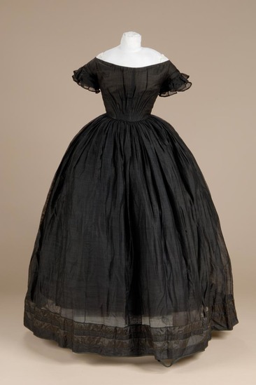 Black dress; thin, almost transparent fabric; short sleeves; top of silk and wool material with two rows of like material sewn on with piping and hemmed at edges; off the shoulder neckline; hook and eyes down back; lined with glazed cotton; pleated at waist in front and back; seven whale bone stays in lining; skirt gathered at waist; bell shaped; bottom bound with black woven tape