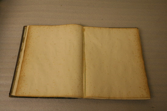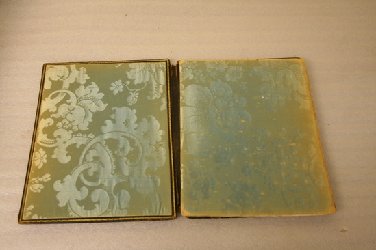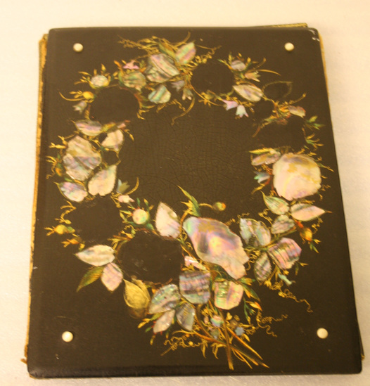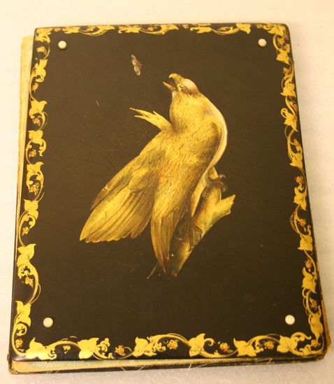 Two wooden boards hinged with leather tooled in gold with small repeating floral vase pattern. The interior contains ends covered in blue silk brocade fabric with the outer edges tooled in gold. Interior also contains 11 sheets of blank paper. The front is made of a thin board or layers of cardboard, the edges beveled and the surface japanned. There are four small buttons of pearl in each corner. Front decoration is a large wreath of flowers made with inlayed pieces of mother of pearl interspersed with free hand leaves and buds in gold, green and washes. The back side has a large bird on a branch snapping at an insect. It is done in gold leaf with realistic brushwork over it. The outside edges have a meandering band of ivy and berries done in gold with red dots