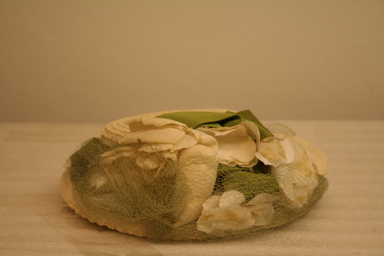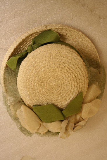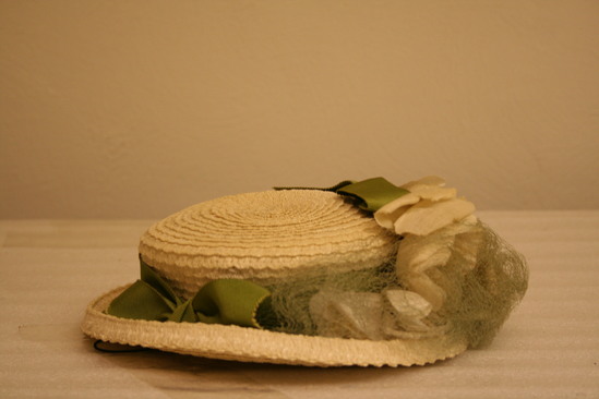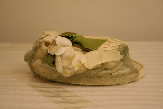 Circular plastic straw hat with 1 1/4" brim and flat top; green grosgrain ribbon around base with bows in back and front; large white cloth flowers covering brim across front; pale green netting attached to brim, hanging down across front; black band; tag in interior "Saks Fifth Avenue debutante/New York creation adjustable"