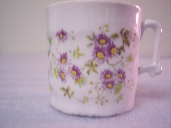 Round, cylindrical body with gothic handle. Painted with purple and yellow flowers with green leaves covering close to the entirety of one side. Round base and some raised work on body. Cup belonged to Miss Fanny Lord of Litchfield. Given by her to Mrs. Hutchins.