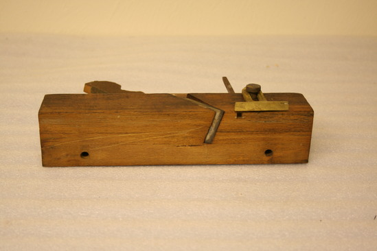 Rectangular wooden plane. Wide, flat iron blade protruding from bottom with wooden peg holding blade in place. Another very thin piece of metal transversing through plane just to the right of the larger blade. On the outside of the plane at this point is a shaped piece of brass - flat on bottom and rounded on top with a screw through elongated oval hole in center. Brass piece is able to slide up and down screw. Stamped on plane "G.S.", "Brooks & Bowles" and "E. Hartford"