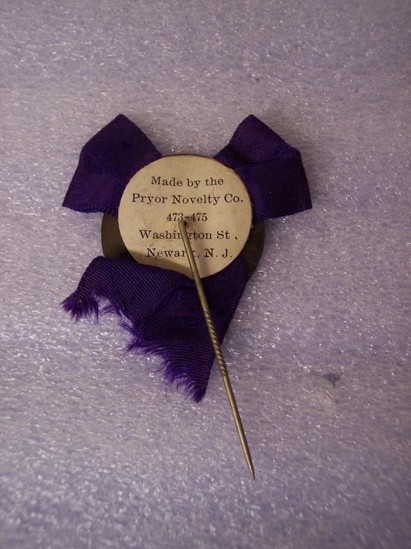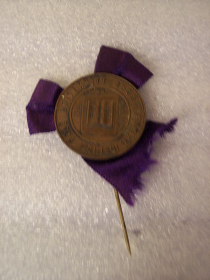 Round bronze medal. Shield in center with open book in middle. Printed on left side of book "Lux", above book "ET" and to right of book "VERITAS" Printed around edge of medal "YALE UNIVERSITY BI-CENTENNIAL 1701-1901" Purple silk ribbon tied in a bow and mounted to back of medal Ends of ribbon extend beyond medal. Large metal stick pin that extends several inches below medal. Paper label glued to back of medal over ribbon "Made by the/Pryor Novelty Co./473-475/Washington St./Newark, NJ"