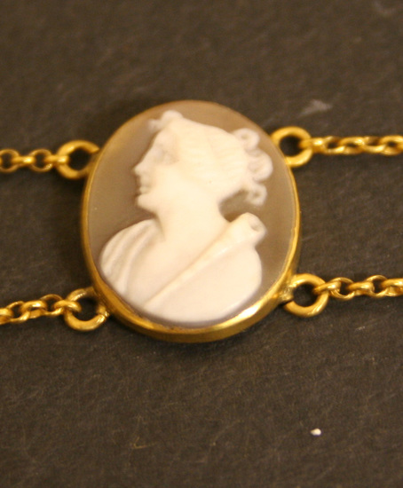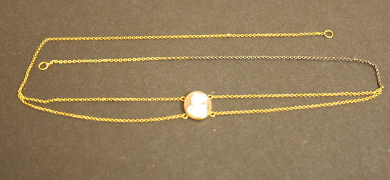 Small oval shaped cameo. Image in white on a reddish/orange background. Cameo of a woman, facing left with head slightly raised. Her hair is pulled back and curled. She wears a robe with a V neckline. The cameo is strung on a double gold linked chain and meant to be worn across the forehead.