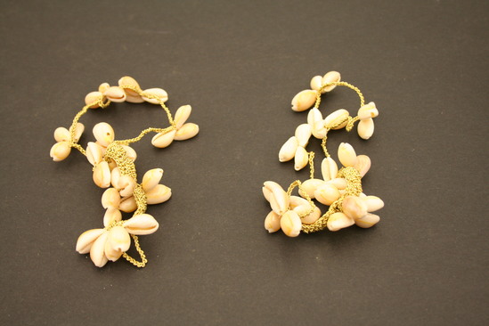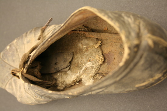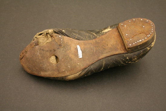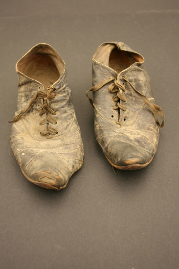 Pair of woman's black leather work or utilitarian shoes; heels are 3/4" high; shoe stops just below ankle; hand stitched leather; lined with thin brown leather at heel and heavy woven cloth on the rest of the interior; holes worn through in soles at the ball of the feet; brown laces in each shoe with metal capped tips; rounded and elongated toe