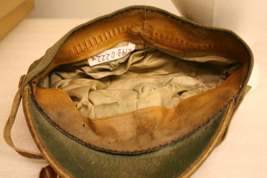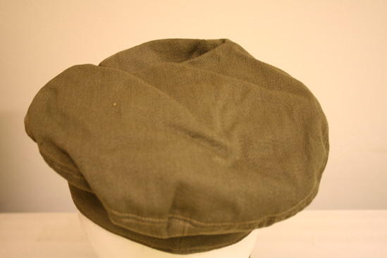 Green cotton cap, straight sides with top larger than base; flat top, tilted back; in front eagle with stars and stripes shield and "Service Aux Armees" banner at base of cap; above that number "6 7" all in metal; a brown visor in front and brown eather band across base; light green lining and light brown band