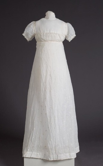 White muslin dress; repeating knotted embroidery design of circles and quarter moons; high waistline; material gathered ; two ties in back and string at front of neckline to tighten material; short sleeves