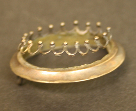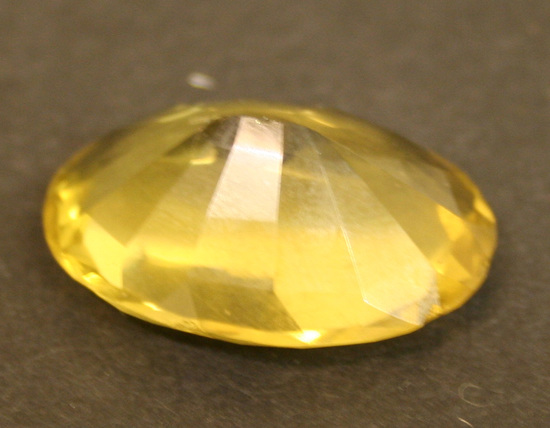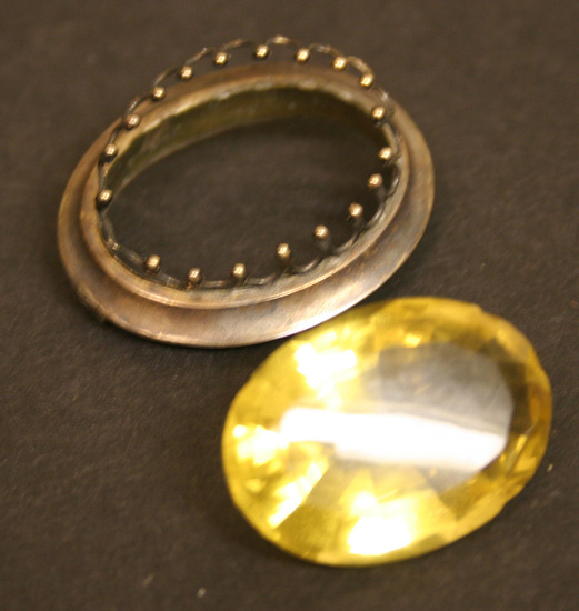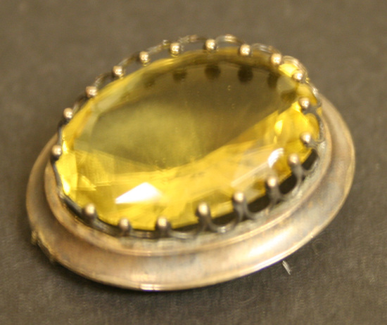 Large yellow faceted stone set in dull gold setting. Series of "teeth" around body of stone to hold it into setting. Wide, stepped gold setting, horizontal pin at back.