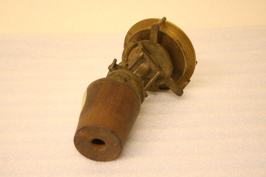 Compass - round wooden base. Hole at bottom of base to probably insert onto a stand. Brass works that allow compass to be turned/tilted in various directions and raised and lowered. Compass round with brass rim. Silver metal face set under glass. Mettal arm that locks across face of compass but can be released and extend along each side of compass.