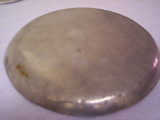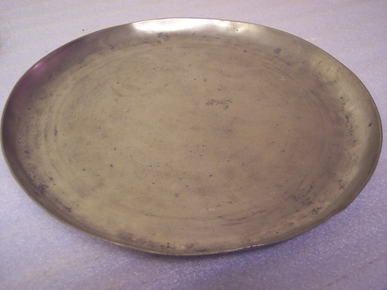 Pewter tray, rimless, three marks on back "TD" and "SB" in rectangles, eagle and shield