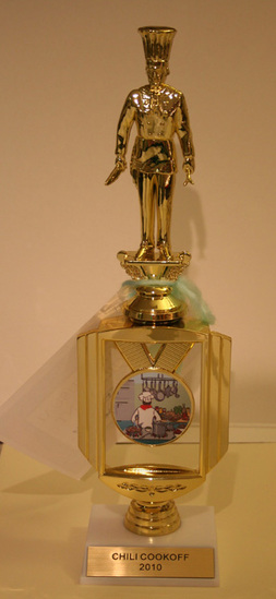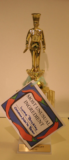 Plastic trophy. White square base with metal plate on front "Chili Cookoff/2010" Gold trophy mounted to base. Man on top wearing chef hat and jacket. Stands on podium which is mounted on a square open in center with a round medal suspended in opening. Color sticker on medal of chef cooking in kitchen. Tied to trophy is paper card "Most Unusual/Ingredient/Lynne Brickley/Chicken/White Bean" Paper decorated with boarder of red chillis.