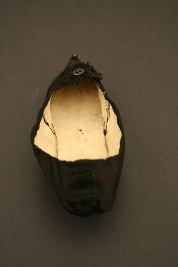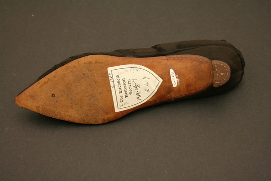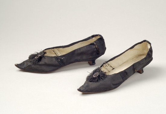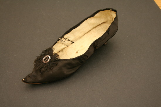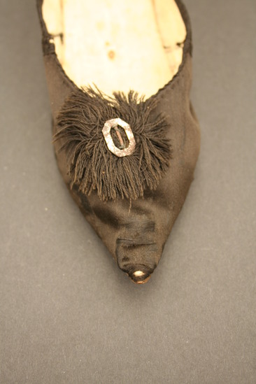 Black silk shoe; heel cover with linen lining; leather sole; Italian style wooden heel 1 1/2" high; pointed toe; cotton thread fringe and metal buckle which is a later addition