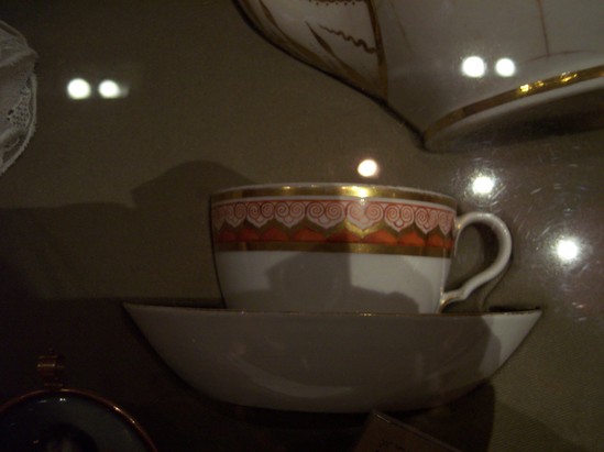 White saucer with gold bands and a gold bordered band of a red leaf and scroll design around the edge. Gold star medallion in the center. Asian inspired design. This is the wedding tea set of Anna Pierce Brace, (Mrs. Charles Loring, married May 6, 1818). Wedgwood #714, "Bittersweet." It was inherited from Mrs. Pennypacher's mother, Mrs. Ruth Loring Whitman; and by her from Mary Hopkins Loring; and by her from Anna Pierce Brace Loring.
