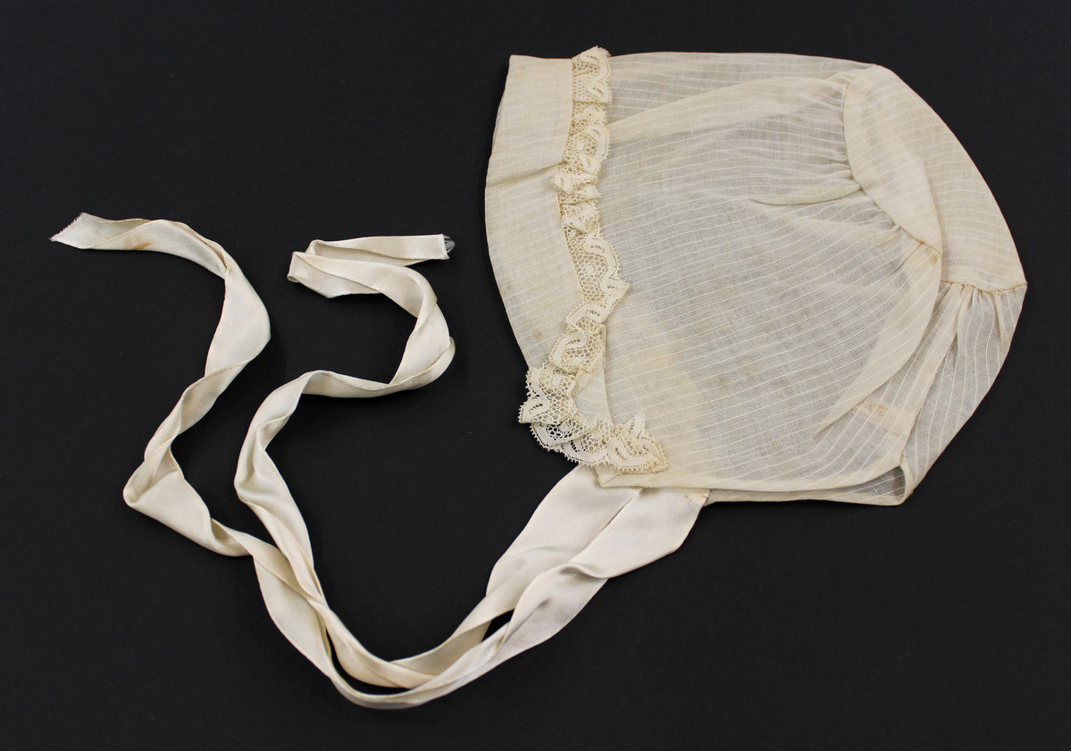 Off-white sheer striped cotton child's bonnet;circular shape at back; folded back around front edge with lace ruffle; off-white satin ribbon ties