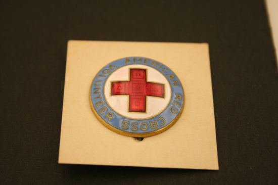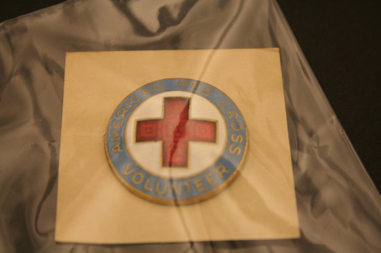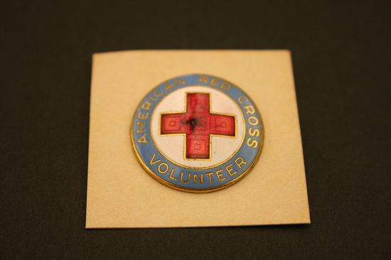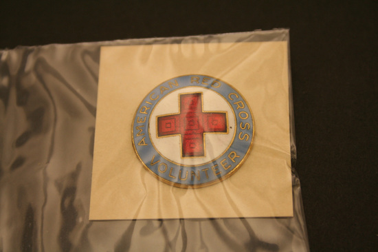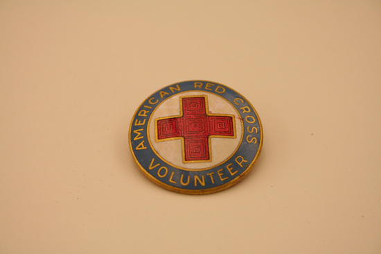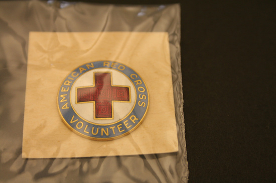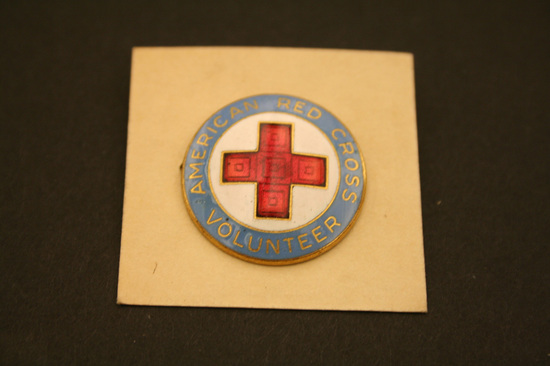 Small round pin, gold plated back, light blue border, white center with red cross in middle. Pritned in gold around outer edge "American Red Cross/Volunteer" 1984-03-12-20 all pinned onto square piece of cardstock