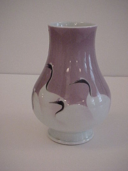 WHITE BOTTOM MERGING SEVEN CRANES WITH DARK HEADS AGAINST PURPLE BACKGROUND. PEDESTAL BASE, BULBOUS BODY. wHITE GLAZE AT BOTTOM OF VASE MORPHS INTO CRANES WITH MAUVE BACKGROUND.