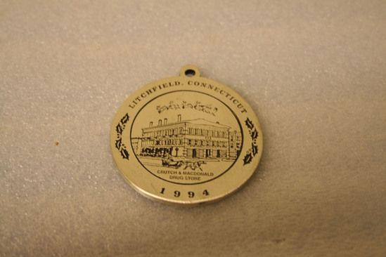 Pewter Christmas ornament. Flat circle with engraved design of an image of Crutch and MacDonald Drug Store building, on the corner of West and South Streets in Litchfield, below image: "Crutch & MacDonald Drug Store." Around outside" "Litchfield, Connecticut/ 1994." The Litchfield Recreation Department commission these ornaments annually from Woodbury Pewter as a fundraiser. The drug store closed in 1994.