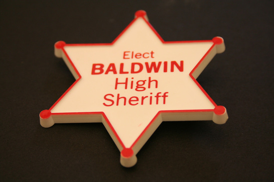 White plastic pin in shape of six pointed star. Metal clasp on back. Red border around star in red lettering in center "Elect/Baldwin/High/Sheriff"