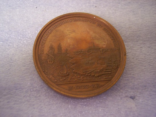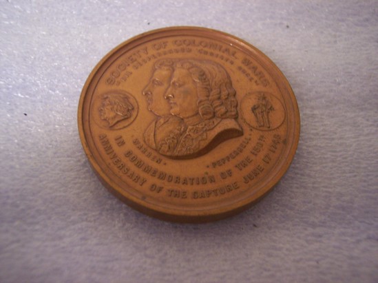 Round bronze medal with smooth edge and raised edge. Front has profile of two men, facing left, identified as Warren and Pepperell. Above images of men, inscrived "Society of Colonial Wars/NIL DESPERANDUM CHRISTO DUCE" Underneath busts inscribed "IN Commemoration of the 150t/Anniversary of the Capture June 17th, 1745" To the left of busts is a small circle with an image of a Native American man. To right is a small circle with an image of a man in colonial dress. On back of medal is a scene of a colonial town on the water surrounded by boats. Inscribed at top "LUDOVICOBURGUM FUNDATUM ET MUNITUM" underneath scene at bottom "M DCC XX"