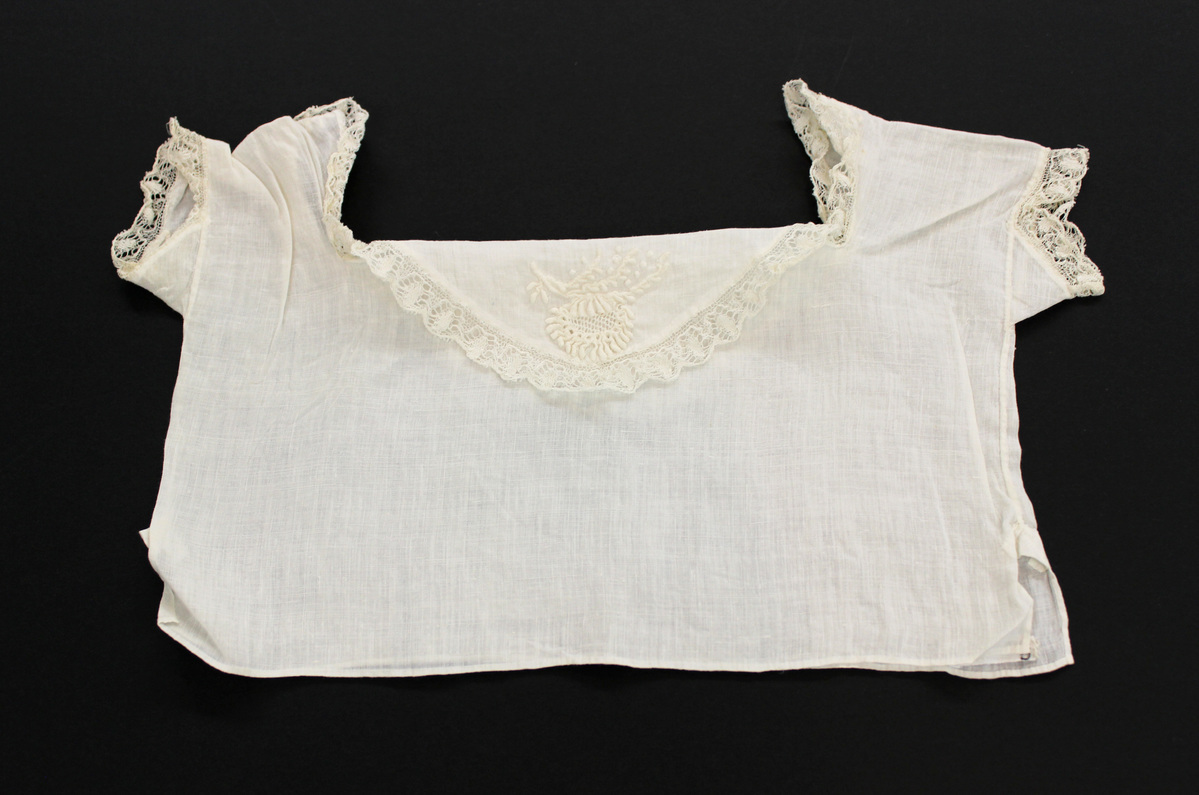 White linen child's undershirt; lace trim at armholes; gussets; flaps over front and back with hand-embroidered flower and lace edging; short sleeves; side vents; hand stitched