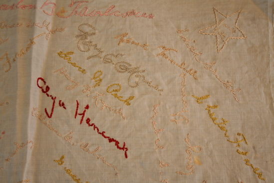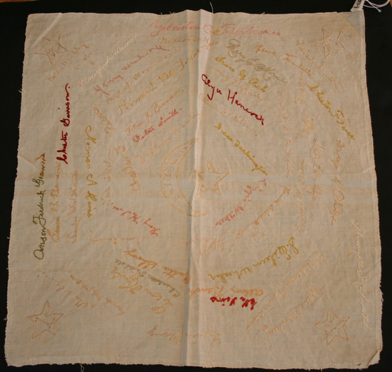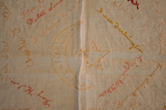 Square of white cotton or linen with embroidered designs: 1. Four stars one in each corner with names: Reginal Hutt, Harry Hutt, Jack Hutt, Jennie Hutt. 2. Large yellow crescent outline in center with Litchfield, Conn in side yellow star with E/S/H. 19/02 for East High School. 3. In various colors handwritten names embroidered about the surface.