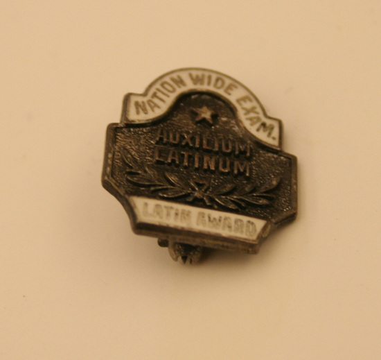 Small pin, top rounded, sides squared. Top has enamel band with wrods "Nation Wide Exam" in center in raised lettering "Auxilium/Latinum" enamel band across bottom with "Latin Award"