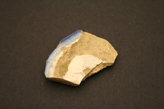 Piece of ceramic; white stoneware with blue glaze on edge; part of plate or saucer