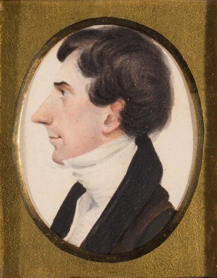 On heavy, cut paper. Man with brown hair and coat, high white collar, short prominent nose.