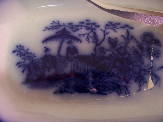 SMALL VEGETABLE DISH. FLOW BLUE TRANSFER PRINTED, WITH ORIENTAL SCENE AND FLORAL BORDER. OCTAGONAL OBLONG WHAPE WITH FLATTISH RIM AND DEEP CENTER.