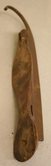 Single ice skate. Iron blade that curves upward in front of foot with small ball at end. Wooden base to skates shaped to conform to shape of foot. Two metal screws protruding upward from base. Two slits in side of body of each skate for leather straps to be woven through