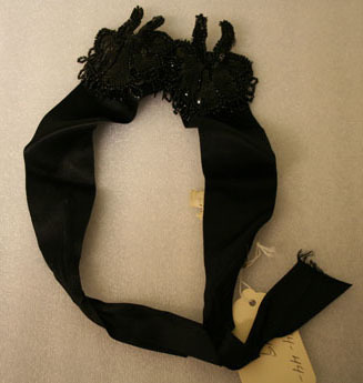 Woman's hair accessory or adornment. 3" wide black satin ribbon with 2 jet beaded flowers at center. Underneath flowers on reverse side of ribbon is small brown plastic comb to hold piece in hair.