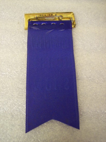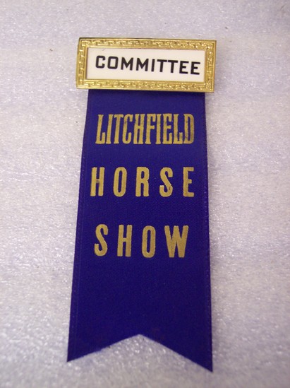 One judge's ribbon badge identifying a "Committee" member of the Litchfield Horse Show. Rectangular brass plated nameplate with pin backing, the center with "Committee" in black on white background, blue silk ribbon with gold embossed lettering "Litchfield Horse Show"