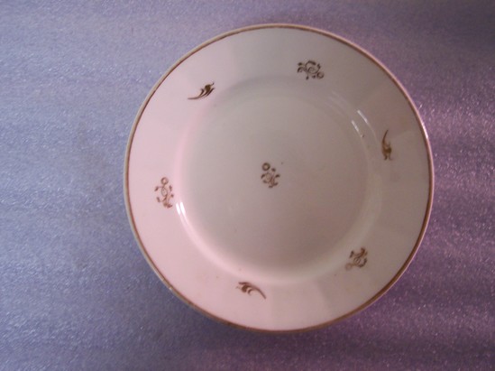 White plate with slightly molded rim and gilt band on rim with 6 small, gilt sprays alternating between 2 designs. One simple gilt spray in the center.