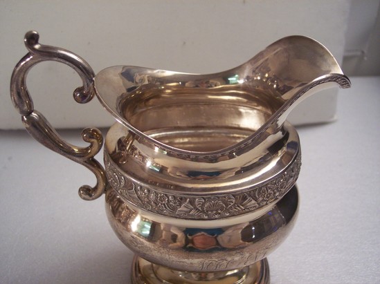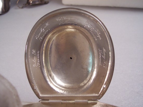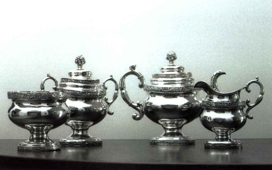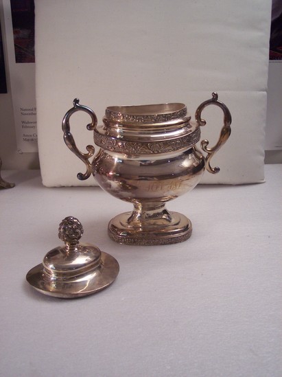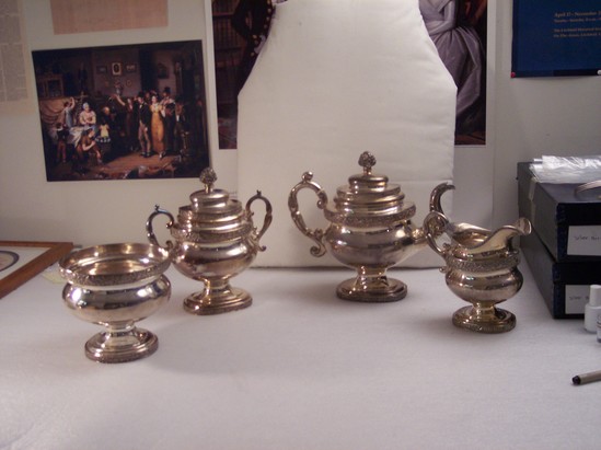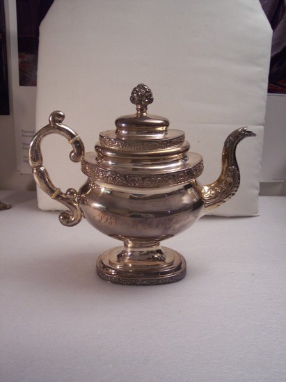 Mr. Trevor called one afternoon and asked if we "have a museum." He said that this silver tea set had been in his attic for many years. He is a descendent of Col. Tallamdge.