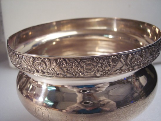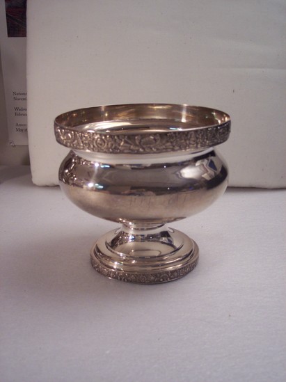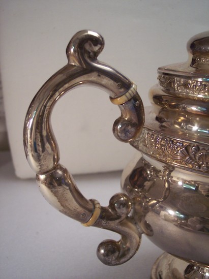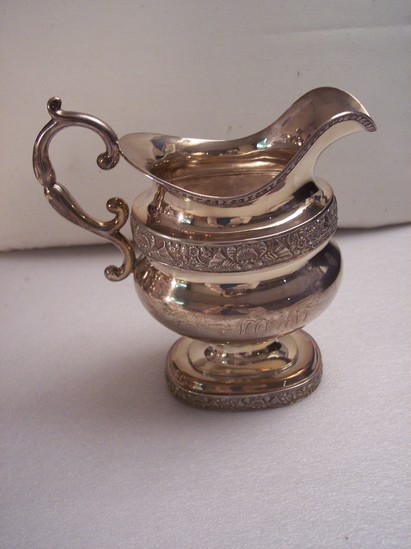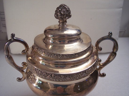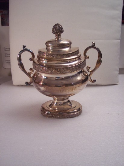Silver tea service. A) Tea pot - pedestal base, S-shaped protruding spout, ear shaped handle. Hinged lid with bouquest of roses and grapes as handle. Monograms on side "JBT/MFT/ENT" On inside of lid, engraved "John B. Trevor/Emily N. Trevor/Col. Benjamin Tallmadge/Henry Floyd Tallmadge/Mary F.T. Norwood" On opposite side of pot "Originally the property of Col. Benjamin Tallmadge 1784/BT/HFT" Raised cornucopia, flowers, leaves in bands along base, rim and top of body. B) Creamer - pedestal base, handle and spout as above. Decoration and monograms as above c) Sugar bowl - Pedestal base, two handle on either side. Decorations and engraving as on A & B. Inside of lid "Silver Tea Set/Belonging to Col. Benjamin Tallmadge/Made of Mexican Dolalrs" d) Waste Bowl - shape and decoration same as A,B,C. No handle