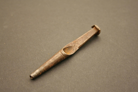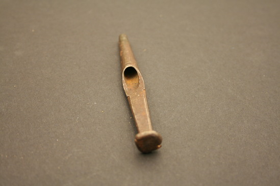 Hole punch - used on leather goods; top has a flat head like a nail - sides are bent from repeated hammering; rectangular rod extends below which narrows and round into a hollow cylinder; open at bottom and at top where rod moves from rectangular to cylinder