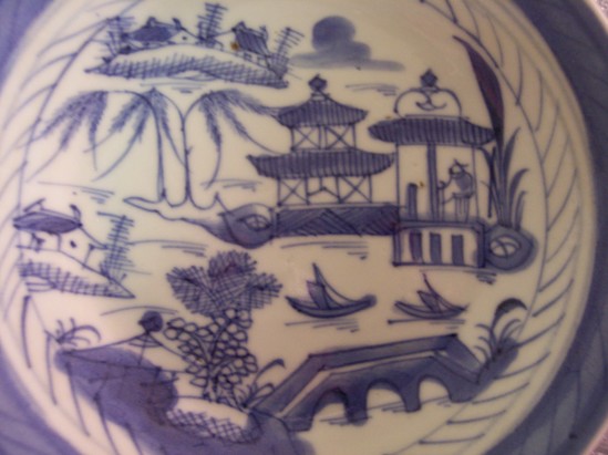 White saucer with blue-banded rim and an Asian scene of two houses, trees, and birds. Slightly lighter blue coloration than the other saucers.