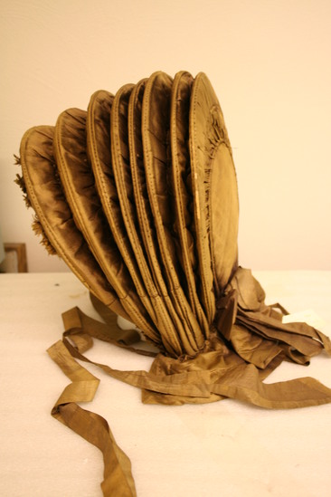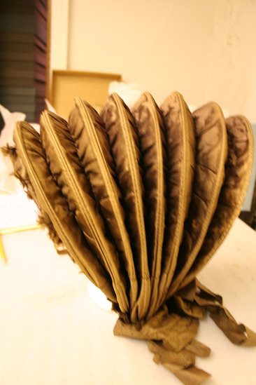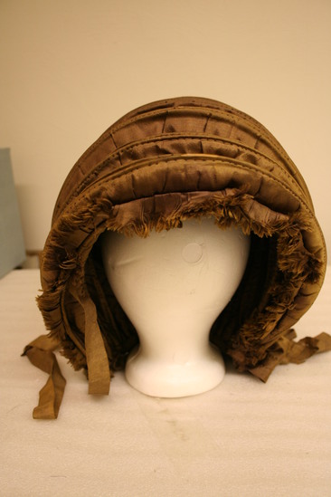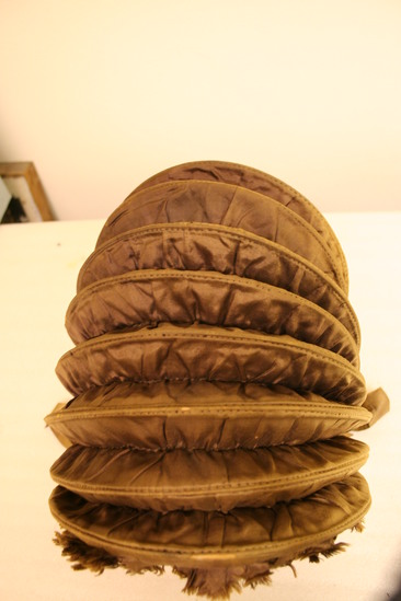Oval frame with acordian shape (opening on top); brown silk with frayed fringe around face; two brown tie ribbons in front and on ribbon half way up on left side; dark brown stitches
