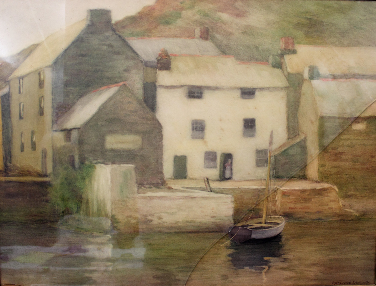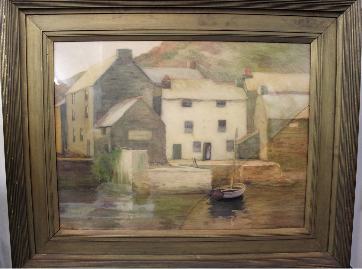 Oil on canvas. An English coastal village featuring grey stone buildings, a boat at anchor in the central foreground, a woman standing in the doorway of one of the buildings. Signed bottom right corner "Adelaide Deming" Label (no longer on back of painting - now in accession folder): "Adelaide Deming/Litchfield, Connecticut A Quiet Day/ 1909 $300. group I Class 2/(Adelaide Deming)/W. S. Budworth& Son, 424 West 52nd St., New York/ Miss Adelaide Deming/Litchfield, Connecticut."