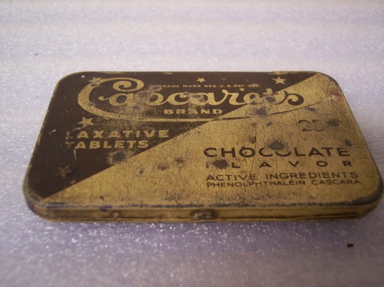 Brown and beige/tan painted tin of "Cascarets Brand /Laxative Tablets/Chocolate Flavor/Active Ingredients/Phenolphthalein Cascara" On back: "Directions/Adults: Take one or two tablets/as needed, preferably at night before ___/Chew well/Children's: One half to one _____/age/ They work while you sleep/The R.L. Watkins Company, New York/Distributors for___ Remedy Company/Contains 18 Tablets"