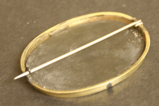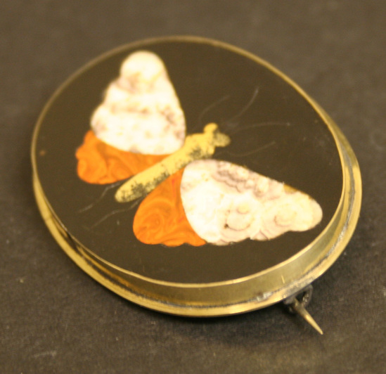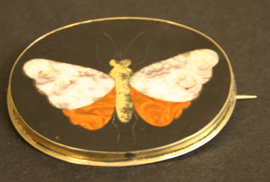 Brooch, oval shape, gold setting with inset of buterfly with white and oranish/red marble wings set in black stone.
